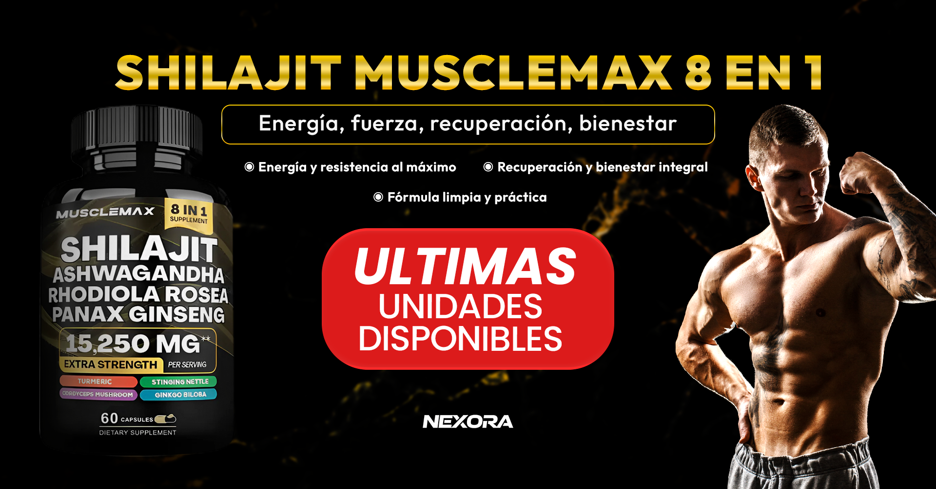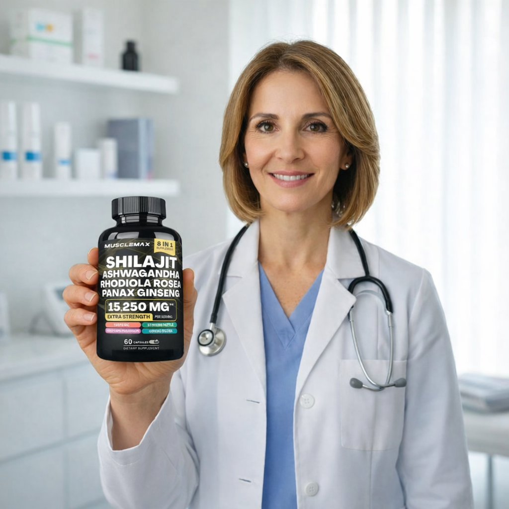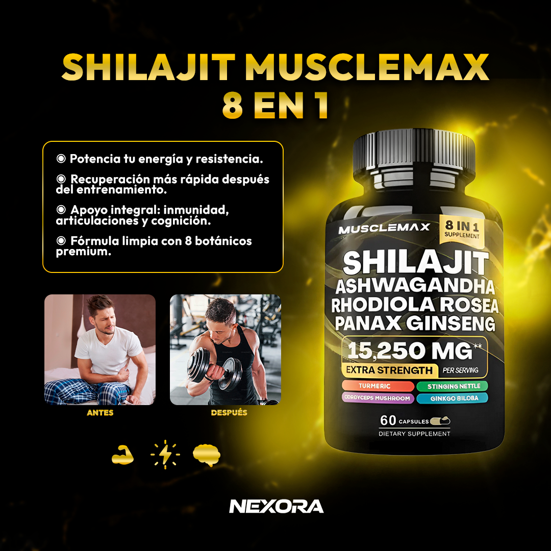 Shilajit MuscleMax 8 en 1 es un suplemento que combina 8 ingredientes naturales y adaptógenos premium como Shilajit, Ashwagandha, Ginseng y Cordyceps, formulados para apoyar la energía, el rendimiento físico, la resistencia y la claridad mental en la rutina diaria.